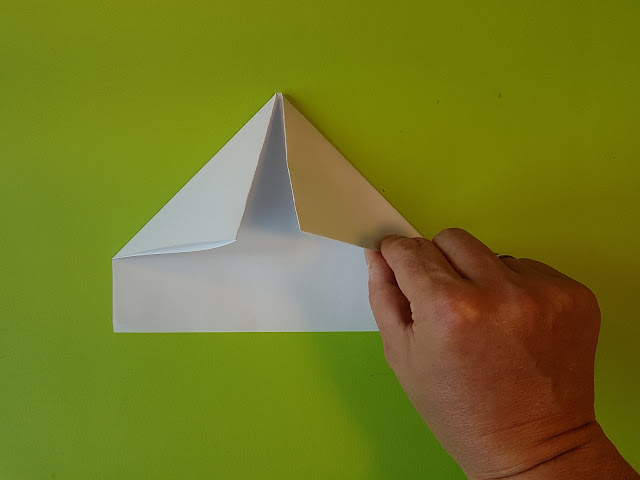 Teraz rogi zagiętej kartki zagnijcie do środka w taki sposób, aby (rogi) zetknęły się. Powstanie wtedy na górze kartki "dziubek".